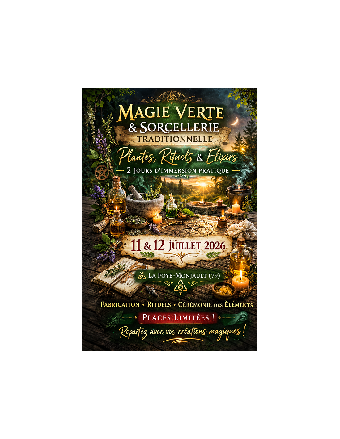 Les 11 et 12 juillet 2026, à La Foye-Monjault (79), ce stage vous propose d’apprendre concrètement à récolter, préparer et utiliser les plantes en magie, en vous appuyant sur les correspondances, les cycles naturels et les pratiques issues des traditions anciennes.